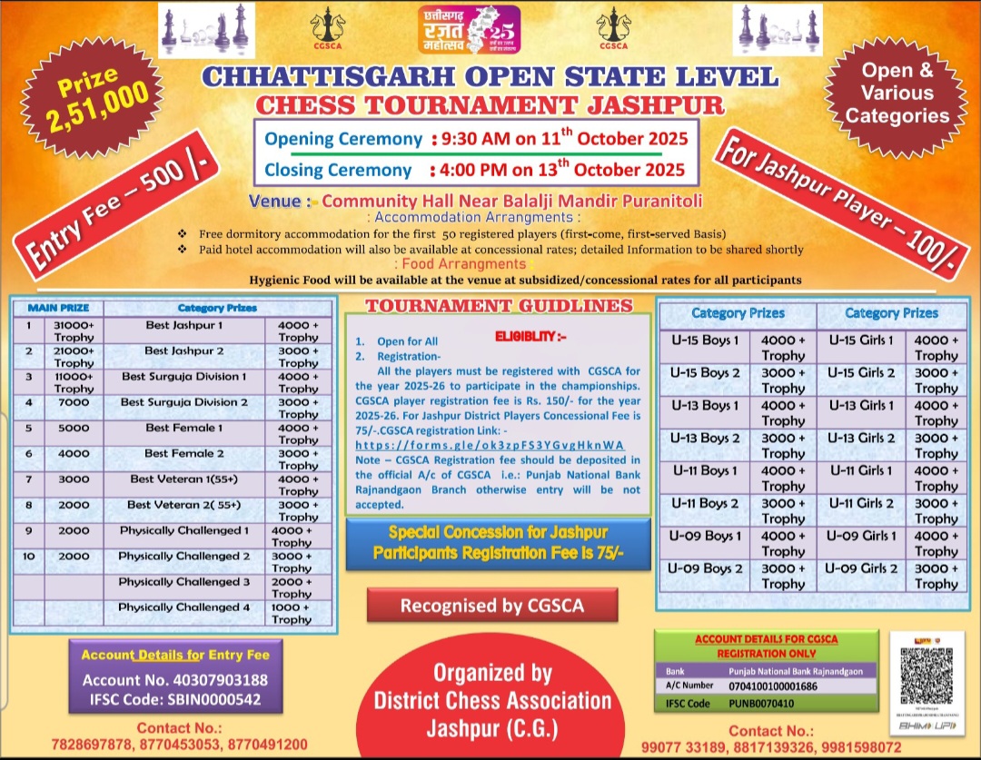 KHELNEWZ RAIPUR DESK राज्य स्तरीय ओपन शतरंज स्पर्धा का आयोजन जशपुर में 11 अक्टूबर से