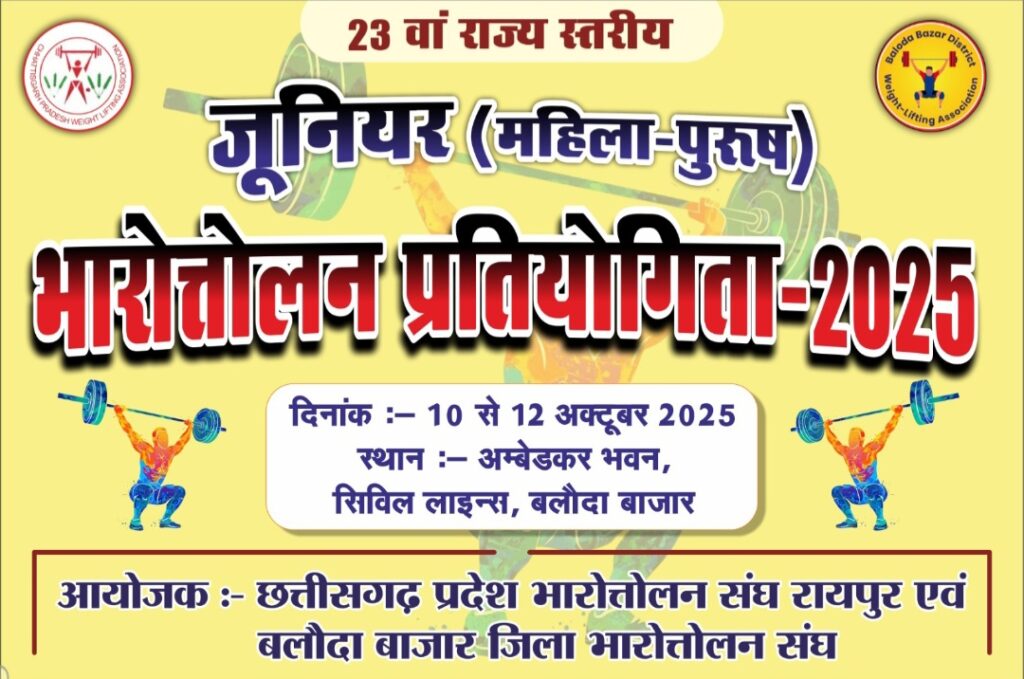 23 वीं राज्य स्तरीय जूनियर ( महिला- पुरुष ) भारोत्तोलन स्पर्धा का आयोजन बलौदाबाजार में छत्तीसगढ़ प्रदेश एवं जिला संघ के संयुक्त तत्वाधान में भारतीय भारोत्तोलन संघ के नई वजन वर्ग समूहों के नियमानुसार पुरुष वर्ग के 8 एवं महिला वर्ग के 8 समूहों का वर्गीकरण करते हुए 10 से 12 अक्टूबर तक अंबेडकर भवन ( मांगलिक भवन ) सिविल लाइन में आयोजित किया जा रहा है.