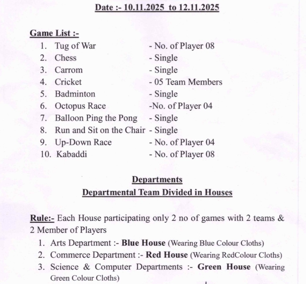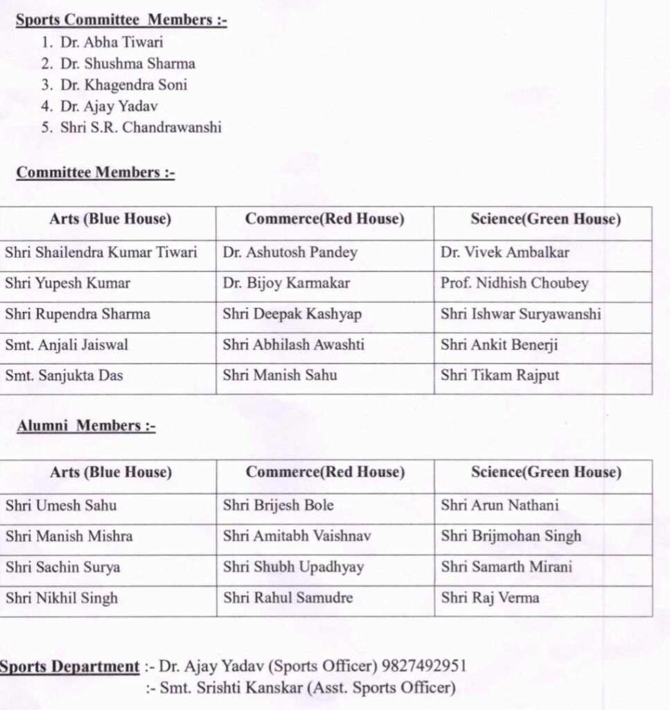 पंडित रामनारायण शुक्ल की स्मृति में डीपी विप्र महाविद्यालय में प्रतिवर्ष अनुसार इस बार भी विप्र खेल दिवस का आयोजन महाविद्यालय प्रांगण में आगामी 10 से 12 नवंबर के मध्य किया जायेगा.