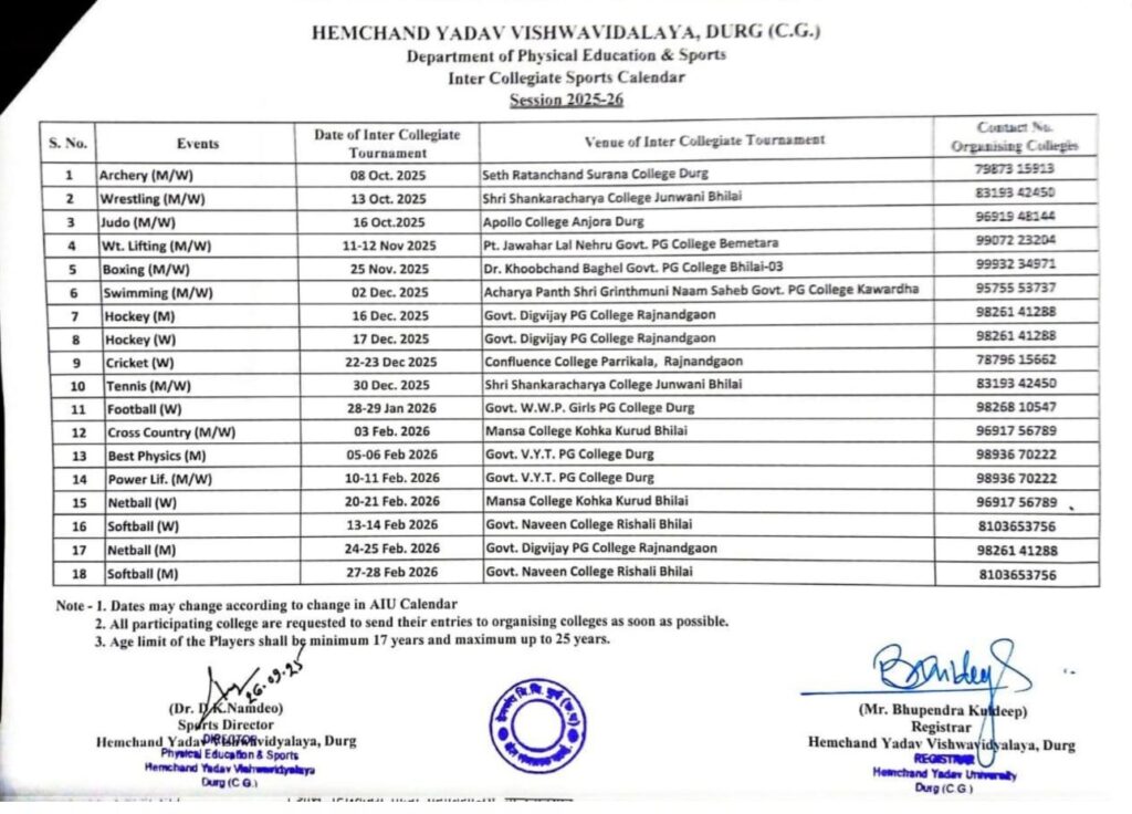हेमचंद यादव विश्वविद्यालय के द्वारा सत्र 2025-26 हेतु वार्षिक स्पोर्ट्स कलेण्डर जारी कर दिया गया है. आठ अक्टूबर से शुरू हो रहे खेल सत्र आगामी फरवरी 2026 तक में अलग अलग विधाओं में अंतर महाविद्यालयीन स्पर्धाएं संपन्न होंगी. सभी स्पर्धा विश्वविद्यालय के अंतर्गत आने वाले 18 महाविद्यलयो की मेज़बानी में संपन्न होंगे.