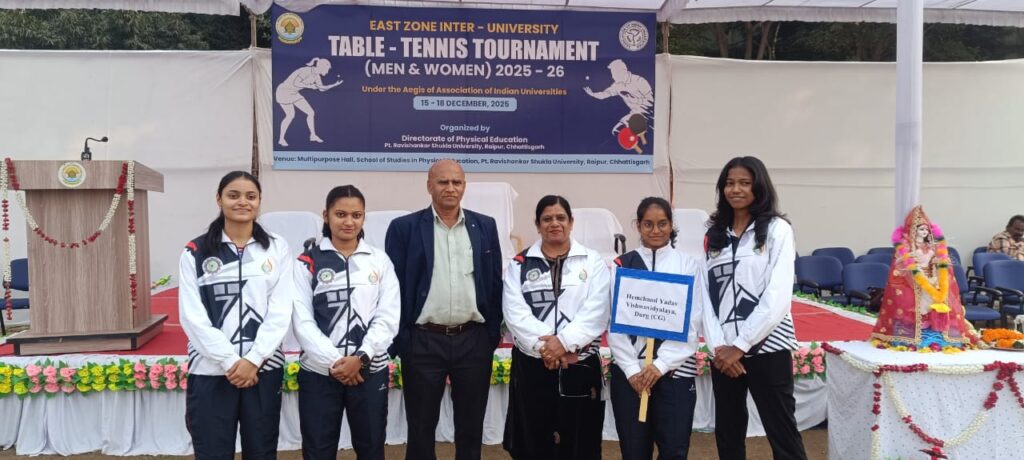 खेल संचालक डाॅ. दिनेश नामदेव ने जानकारी देते हुए बताया कि पहले मैच में डिब्रुगढ़ विश्वविद्यालय से वाॅकओवर मिला, दुसरे मैच में टेक्नीकल विश्वविद्यालय भिलाई को 3-0 पराजित की, तीसरे मैच में अरूणांचल प्रदेश विश्वविद्यालय को 3-0 से पराजित की एवं चतुर्थ मैच में जाधवपुर विश्वविद्यालय वेस्ट बंगाल से वाॅक ओवर मिला। खेल संचालक ने बताया कि विश्वविद्यालय की टेबल टेनीस महिला टीम पहली बार आल इंडिया प्रतियोगिता में भाग लेगी।