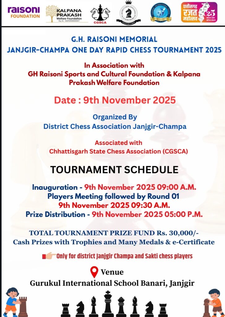 छत्तीसगढ़ राज्य के रजत जयंती अवसर पर एच. रायसोनी स्पोर्ट्स एंड कल्चरल फाउंडेशन एवं कल्पना प्रकाश वेलफेयर फाउंडेशन की संयुक्त पहल पर, प्रदेश शतरंज संघ के मार्गदर्शन में तथा गुरुकुल इंटरनेशनल स्कूल के सहयोग से जिला संघ द्वारा एक दिवसीय रेपिड शतरंज प्रतियोगिता का आयोजन किया जा रहा है। यह प्रतियोगिता 9 नवंबर को प्रातः 9 बजे से गुरुकुल इंटरनेशनल स्कूल, बनारी (जांजगीर) में प्रारंभ होगी।