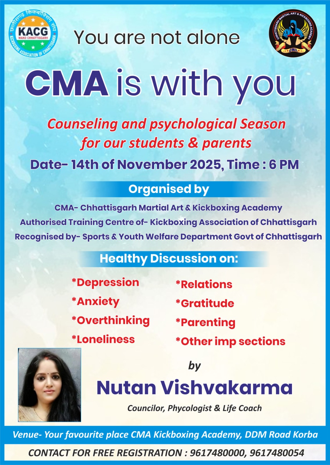 छत्तीसगढ़ किकबॉक्सिंग एसोसिएशन से संबद्ध प्रशिक्षण केंद्र सीएमए मार्शल आर्ट एवं किकबॉक्सिंग एकेडमी द्वारा 14 नवंबर चिल्ड्रन डे के उपलक्ष्य में खिलाड़ियों के लिए काउंसलिंग एवं साइकोलॉजिकल सेमिनार का आयोजन कर रही है।