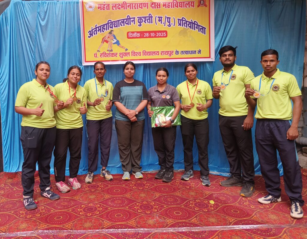 महंत लक्ष्मी नारायण दास के तत्वाधान में अंतर महाविद्यालयीन कुश्ती प्रतियोगिता का आयोजन 28 अक्टूबर को किया गया. जिसमे यूटीडी पंडित रविशंकर शुक्ल विश्वविद्यालय की महिला एवं पुरुष टीम ने शानदार प्रदर्शन करते हुए महिला वर्ग के 50 किग्रा में लक्ष्मी ने रजत पदक, 57 किग्रा में चेतना सिंह ने स्वर्ण पदक,65 किग्रा में अनुष्ठा मित्तल ने स्वर्ण पदक, 72 किग्रा में प्राची चौबे ने स्वर्ण पदक प्राप्त किया तथा पुरुष वर्ग में 61 किग्रा देव कुमार ने रजत पदक तथा 97 किग्रा प्रियांशु बंजारे ने रजत प्रदक प्राप्त किया.