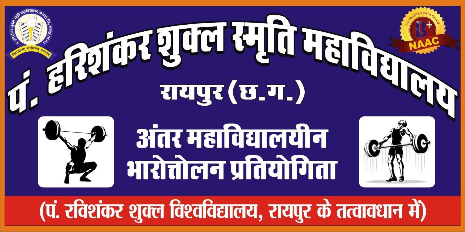 हरिशंकर शुक्ल स्मृति महाविद्यालय में इंटर कॉलेज वेटलिफ्टिंग प्रतियोगिता 06 नवंबर को आयोजित किया जाएगा. इस प्रतियोगिता में पंडित रविशंकर शुक्ल विश्वविद्यालय से संबंधित कॉलेज के खिलाड़ी भाग ले सकते है.यह स्पर्धा भारतीय भारोत्तोलन संघ के नए नियमों के अनुसार 08 वर्ग समूह में आयोजित किया जाएगा।