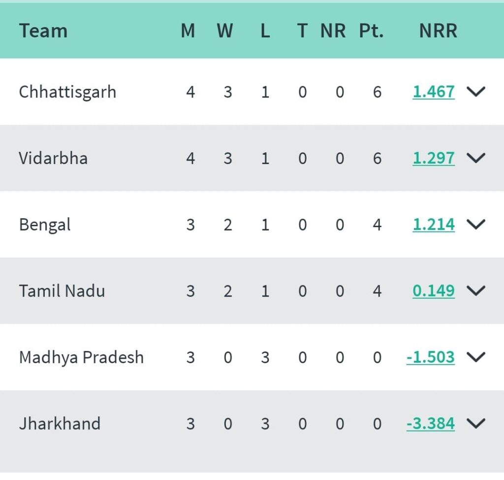 77 रनों के लक्ष्य का पीछा करने उतरी छत्तीसगढ टीम ने 13.1 ओवरों में 4 विकेट खोकर 78 रन बनाकर मैच आसानी से जीत लिया। छत्तीसगढ की ओर से कप्तान कृति गुप्ता ने 42 रनों कीनाबाद पारी खेली। उनके अतिरिकत ऐश्वर्या सिंह ने 13 रन तथा प्रिति यादव ने नाबाद 11 रनों का योगदान दिया ।