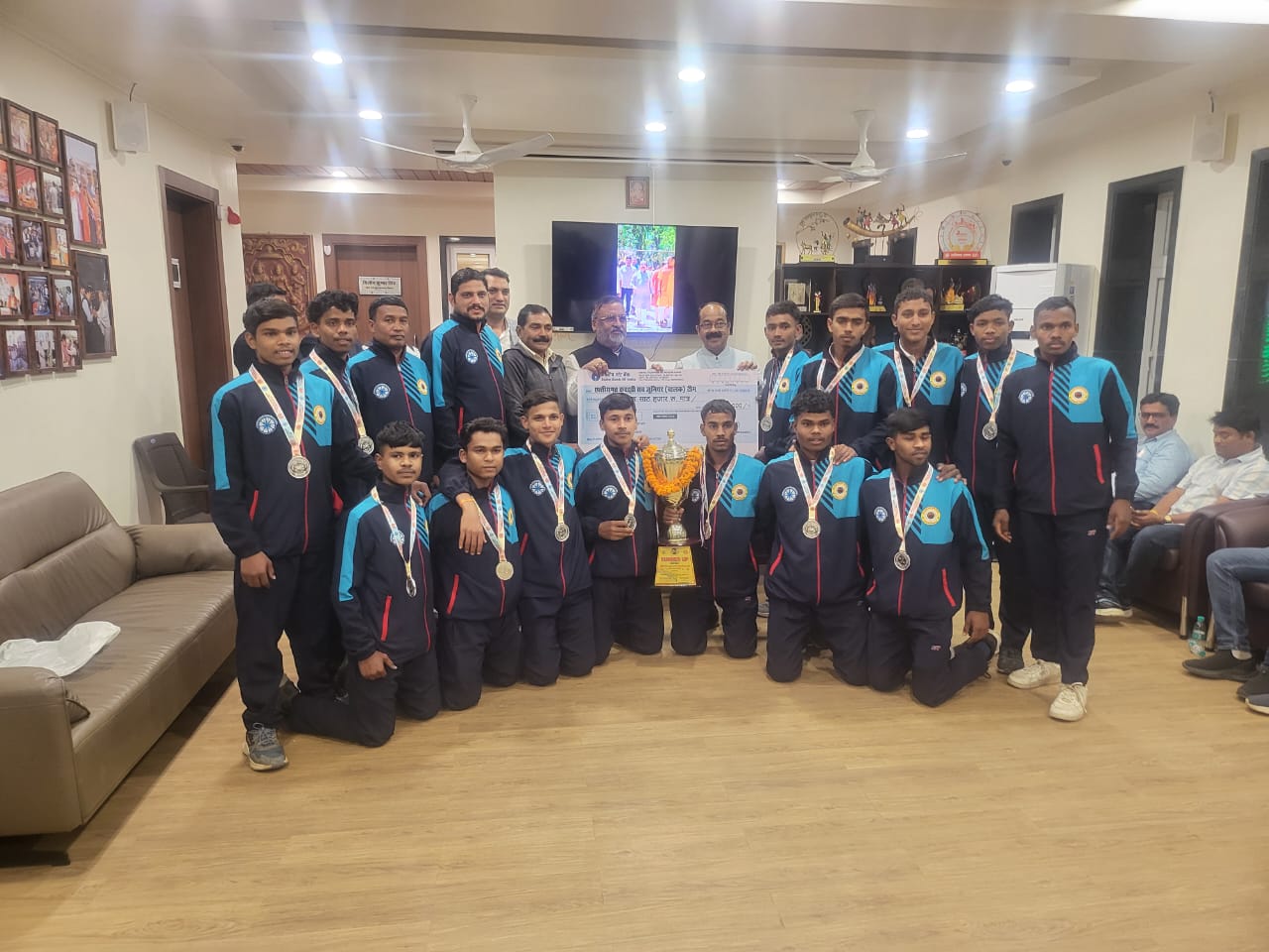 35 वीं राष्ट्रीय सब जूनियर कबड्डी चैम्पियनशिप मे रजत पदक विजेता छत्तीसगढ़ बालक दल ने कल उपमुख्यमंत्री एवं खेल मंत्री श्री अरुण साव से सौजन्य भेंट किया . श्री साव ने विजेता खिलाड़ियों को शुभकामनाएं दिए तथा नगद 1 लाख 60 हजार रुपये की राशि भी विजेता खिलाड़ियों को प्रदान किये. Is अवसर पर छत्तीसगढ़ कबड्डी संघ के अध्यक्ष शशिकांत बघेल एवं सेवा राम साहू कोषाध्यक्ष छत्तीसगढ़ कबड्डी संघ उपस्थित रहे.