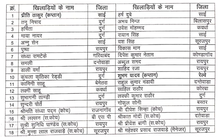 दोनों वर्गों की टीम की घोषणा एवं किट वितरण आज सप्रे स्कूल वॉलीबाल मैदान में मों. अकरम खान उपाध्यक्ष छ.ग. स्टेट वॉलीबाल एशोसिएशन, विनोद नायर इंटरनेशनल रेफरी एवं राजेन्द्र राय सचिव दुर्ग जिला वॉलीबाल संघ के द्वारा की गई। जिसमें महिला वर्ग में प्रीति ठाकुर एवं पुरूष वर्ग में शुभम यादव को टीम की कमान सौपी गई है.