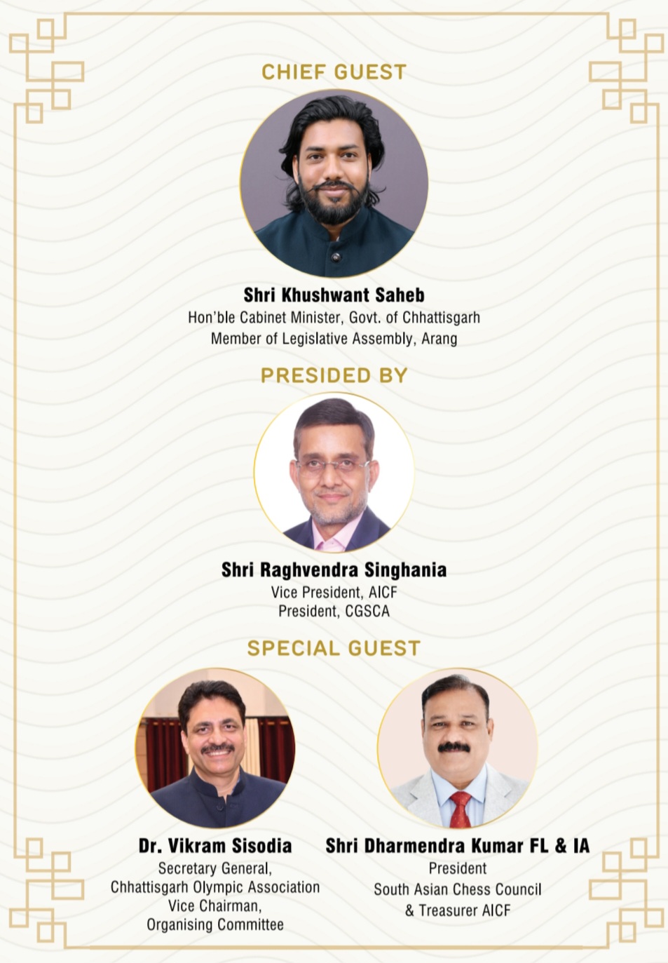 जिसके मुख्य अतिथि छत्तीसगढ़ शासन के केबिनेट मंत्री कौशल विकास, तकनीकी शिक्षा एवं रोजगार एवं अनुसूचित जाति विकास मंत्रालय गुरु खुशवंत साहब होंगे। कार्यक्रम की अध्यक्षता आल इंडिया चेस फेडरेशन के उपाध्यक्ष एवं प्रदेश शतरंज संघ के अध्यक्ष राघवेन्द्र सिंघानिया एवं विशिष्ट अतिथि के रूप में छत्तीसगढ़ ओलम्पिक संघ के महासचिव डॉ विक्रम सिसोदिया तथा साउथ एशियन चेस काउंसिल के अध्यक्ष एवं आल इंडिया चेस फेडरेशन के कोषाध्यक्ष धर्मेंद्र कुमार होंगे ।
