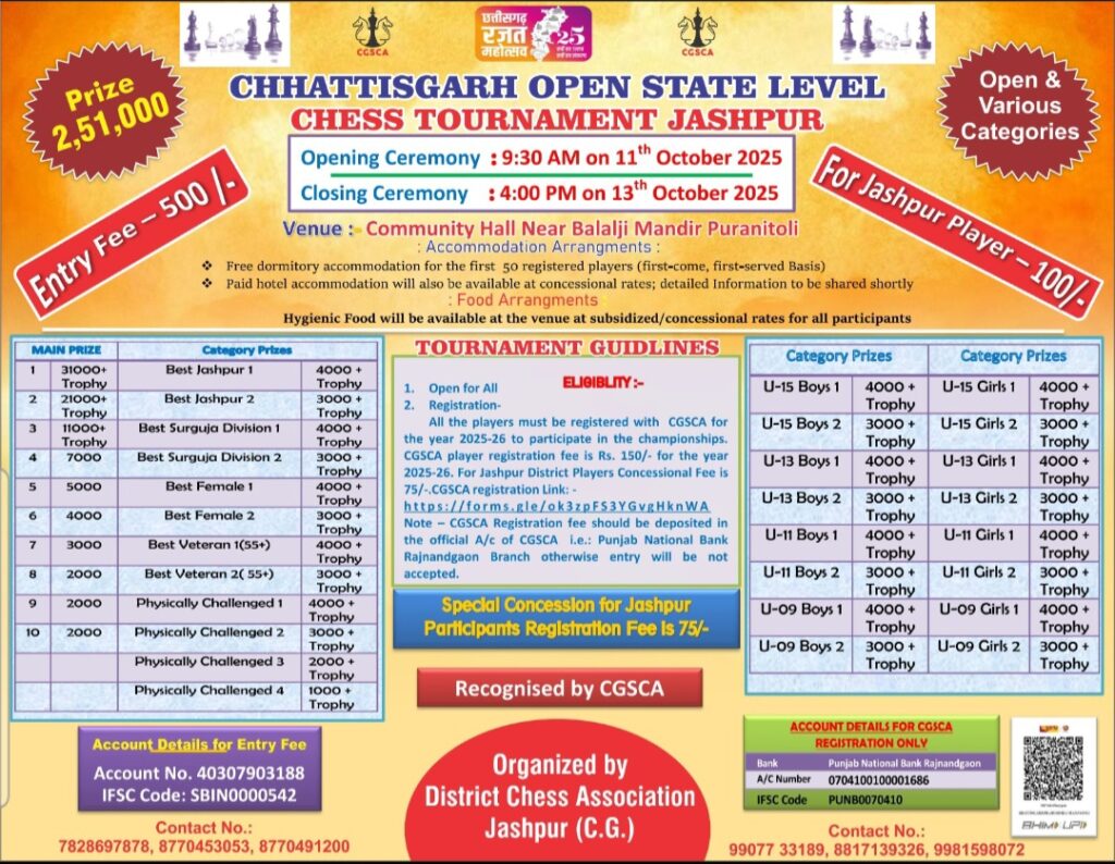 छत्तीसगढ़ के 25 वें वर्ष रजत जयंती समारोह के उपलक्ष्य में जिला प्रशासन जशपुर द्वारा आयोजित एवं प्रदेश शतरंज संघ से मान्यता प्राप्त जिला शतरंज संघ द्वारा 11 से 13 अक्टूबर तक राज्य स्तरीय ओपन शतरंज स्पर्धा का भव्य आयोजन किया गया है।